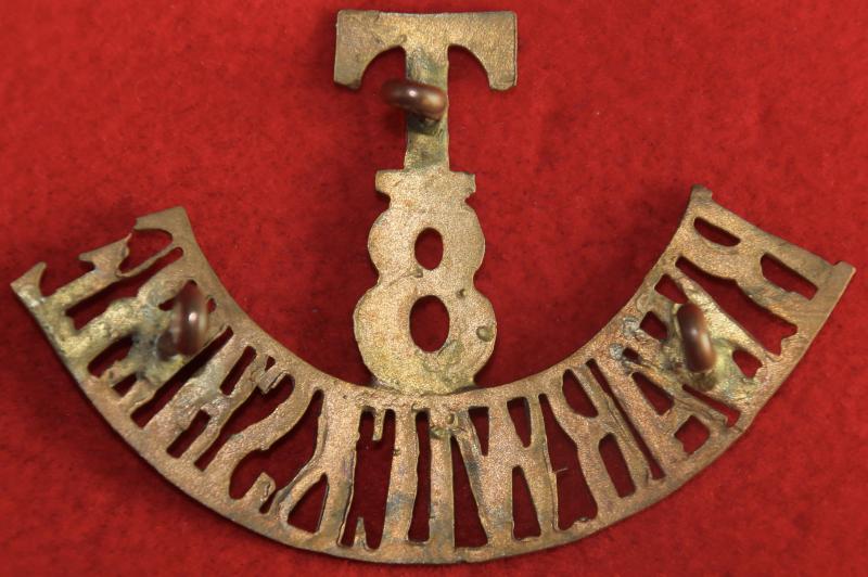 A brass shoulder title for the 8th (territorial) battalion of The Royal Warwickshire Regiment with three lug fastenings (north, east and west). Westlake 787.