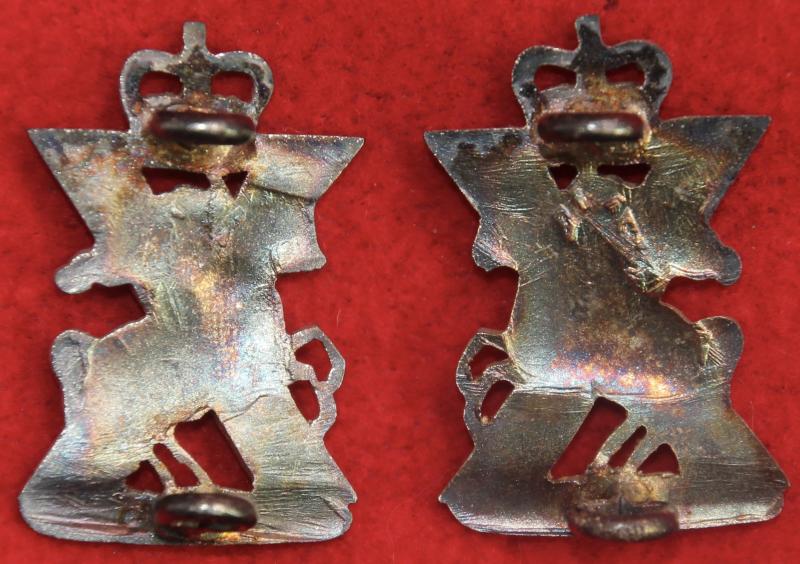 A pair of silver-plated collar badges for an officer of The Highland Yeomanry (Fife & Forfar Yeomanry/Scottish Horse), each with two lug fastenings (north and south). Churchill & Westlake 120.