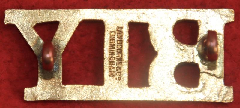 A scarce, brass, shoulder title for The Bedfordshire Imperial Yeomanry with two lug fastenings (east and west - likely replacements). The reverse is marked for manufacturer Lambourne & Co Birmingham. Westlake 347.