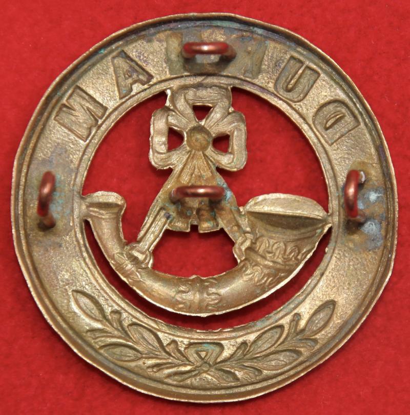 A brass helmet plate centre for The Durham Light Infantry with all four of its staple-style loop fastenings intact. KK350.