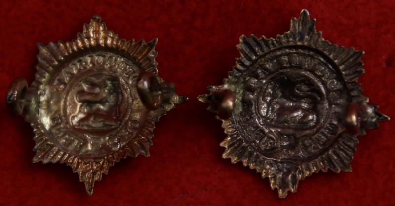 A scarce pair of brass, collar badges for The Worcestershire Regiment, each with two lug fastenings (east and west). The central lions are polished. Churchill 801.
