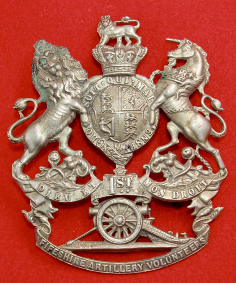 A non-voided pattern, white metal, glengarry badge for the 5th volunteer battalion of The Royal Scots (The Lothian Regiment) with two lug fastenings (east and west). HQ at Leith. Bloomer 2, 43.