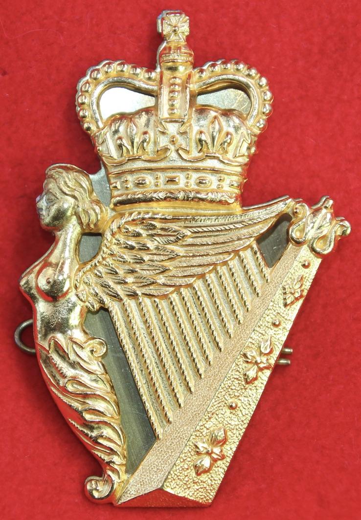 A silver-plated bonnet badge for a piper of The Royal Irish Regiment with three lug fastenings (north, east and west). Some discolouration. Approximately 52.5mm wide x 77.5mm tall. Hodges p174/175 reference 26. read more