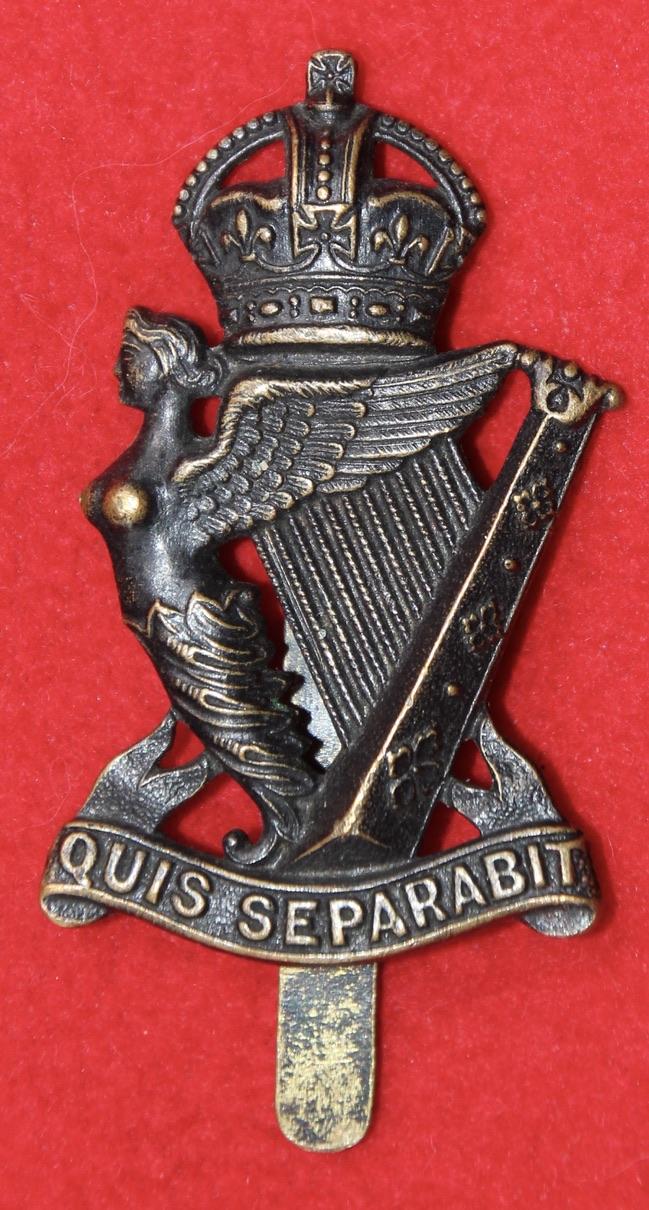 A bi-metal cap badge for The Royal Munster Fusiliers with a slider fastenings and 'sweathole' construction. KK701.