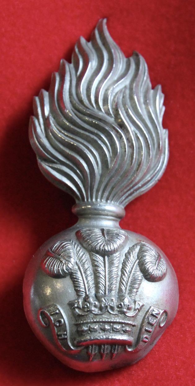 A white metal fur cap grenade for a volunteer battalion of The Royal Welsh Fusiliers with two long lug fastenings (north and south). KK951. read more