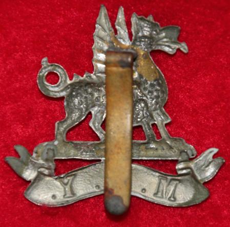 A rare, white metal, cap badge for The Montgomeryshire Imperial Yeomanry with a slider fastening. KK1347.