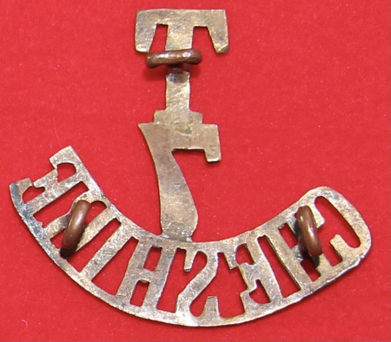 A brass shoulder title for the 7th (territorial) battalion of The Cheshire Regiment with three lug fastenings (north, east and west). Westlake 961.