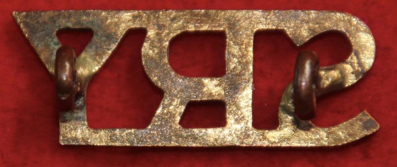 A scarce, brass, shoulder title for an officer of The Sherwood Rangers Yeomanry with two lug fastenings (east and west). Westlake 222. Westlake states the SRY titles were introduced in 1952.