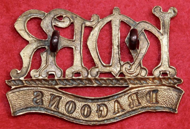 A nice, brass, shoulder title for Her Majesty's Reserve Regiment of Dragoons with two lug fastenings (east and west). Westlake 1591.
