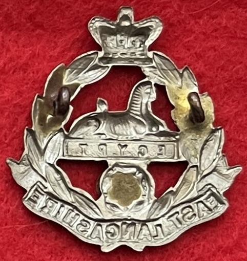 A bi-metal cap badge for The East Lancashire Regiment with two lug fastenings (east and west) and the usual ‘sweathole’ construction. KK637.