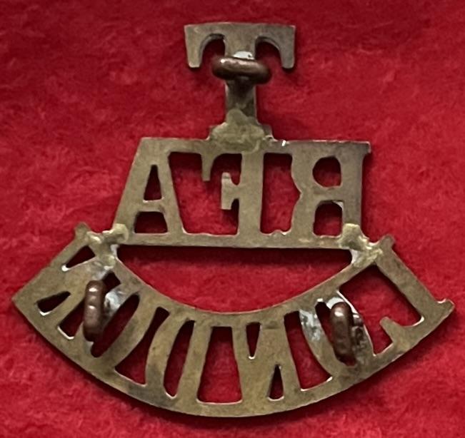 A brass shoulder title for the (territorial) London division of The Royal Field Artillery with three lug fastenings (north, east and west). Westlake 623.