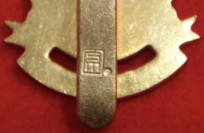 A gilt and enamel cap badge for The Queen's Lancashire Regiment with a slider fastening (marked SM for manufacturer Shaw, Munster). As Marsh NMD21.