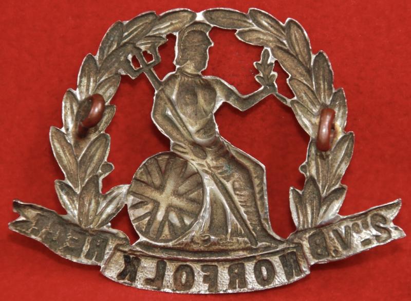 A scarce, white metal, cap badge for the 2nd volunteer battalion of The Norfolk Regiment with two lug fastenings (east and west). Headquarters at Great Yarmouth. Gaylor plate 24.