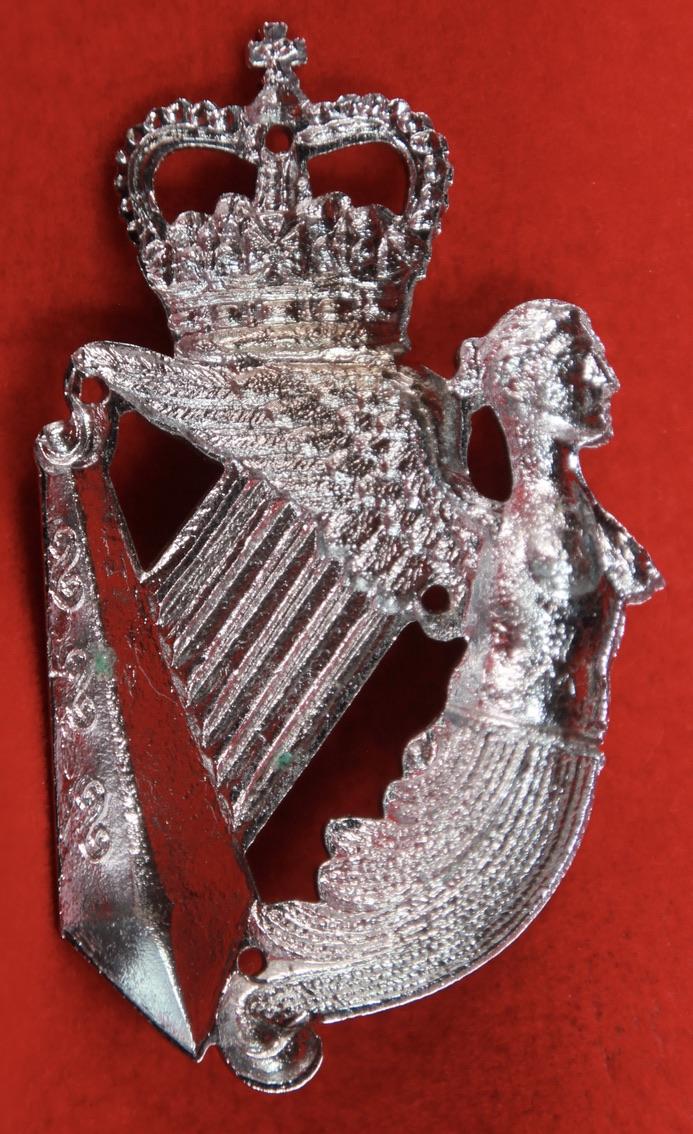 A white metal arm badge for a non-commissioned officer of The Queen's Royal Irish Hussars. Linaker & Dine 24.1B. Note: This badge has four small holes so it can be sewn to the uniform.