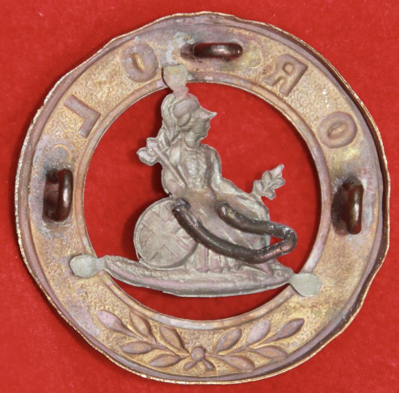 A bi-metal helmet plate centre for The Norfolk Regiment with all four of its staple-style loop fastenings intact (the central loop is bent/twisted). KK366. Note: This is the version with Britannia's hand lowered.