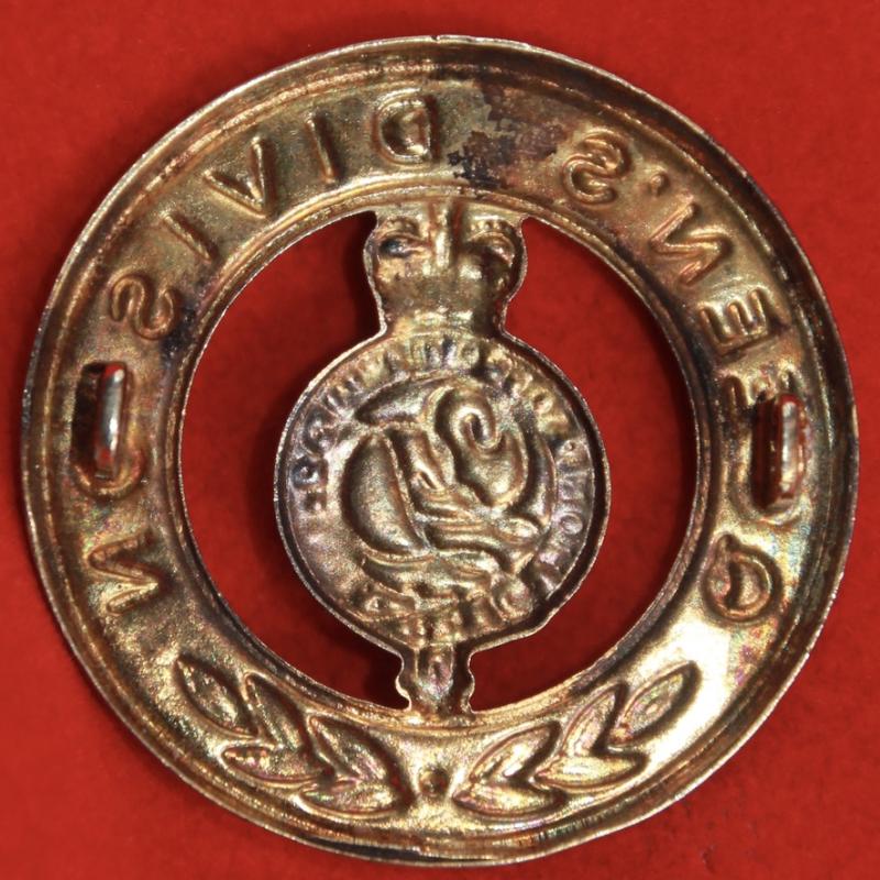 A bi-metal and acrylic helmet plate centre for The Queen's Division Band with two staple-style loop fastenings (east and west). KK2740.