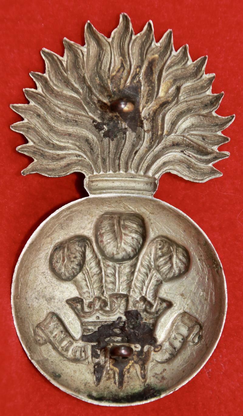 A scarce, white metal, glengarry grenade for a volunteer battalion of The Royal Welsh Fusiliers with two lug fastenings (north and south). KK967.