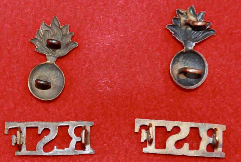 A pair of two-piece, brass, shoulder titles for The Royal Scots Fusiliers, each with two standard lug fastenings on the grenade and two hexagonal lug fastenings on the RSF. Westlake 945.