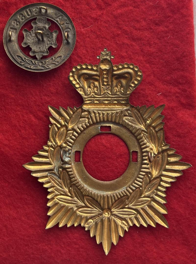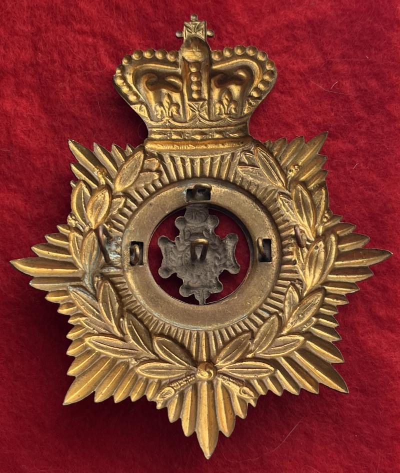 A brass helmet plate for The Royal Sussex Regiment with two staple-style loop fastenings on the backplate and all four on the centre. KK287/327.
