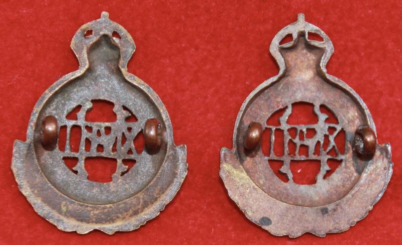 A scarce pair of officer's service dress, bronzed, collar badges for The 18th Hussars, each with two lug fastenings (east and west). Churchill & Westlake 34.