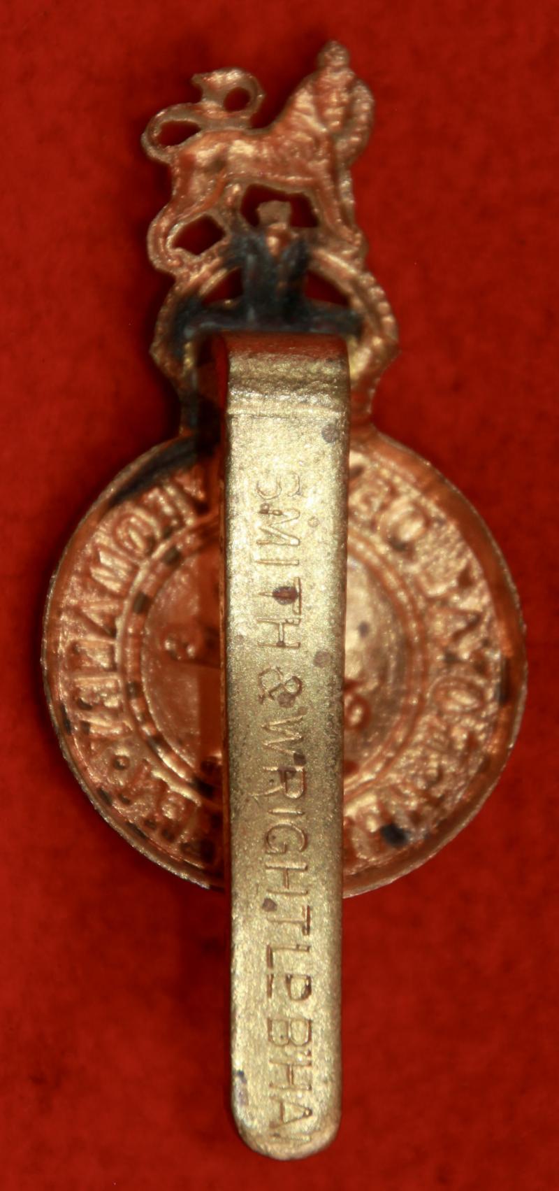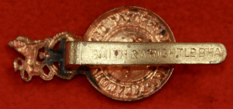 A brass cap badge for The Royal Devon Yeomanry (Artillery) with a slider fastening (marked Smith & Wright Ld Bha - the final M is partially cut off). As KK2302.