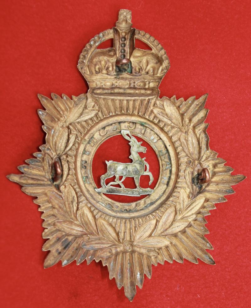 A post-1902, bi-metal, helmet plate for The Royal Warwickshire Regiment with three (standard) lug fastenings on the backplate (north, east and west). KK358/364.