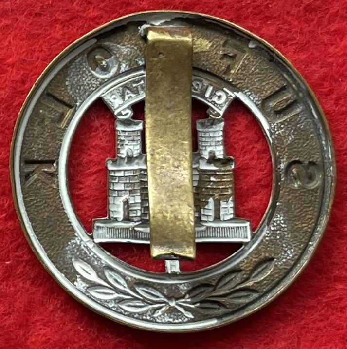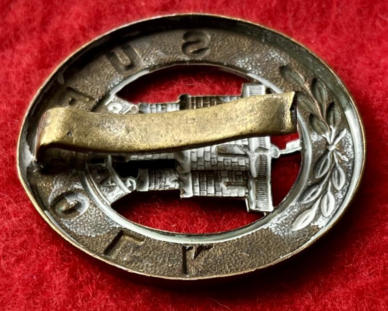 A three-towered, brass, puggaree badge for The Suffolk Regiment with a (clipped) slider fastening. KK371. Note: The castle was changed to a three-towered version after 1900.