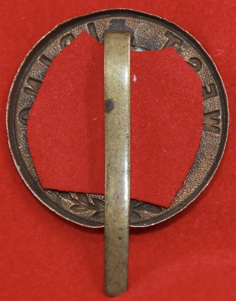A brass puggaree badge for The Duke of Wellington's (West Riding, of Yorkshire) Regiment with a long slider fastening. KK324.