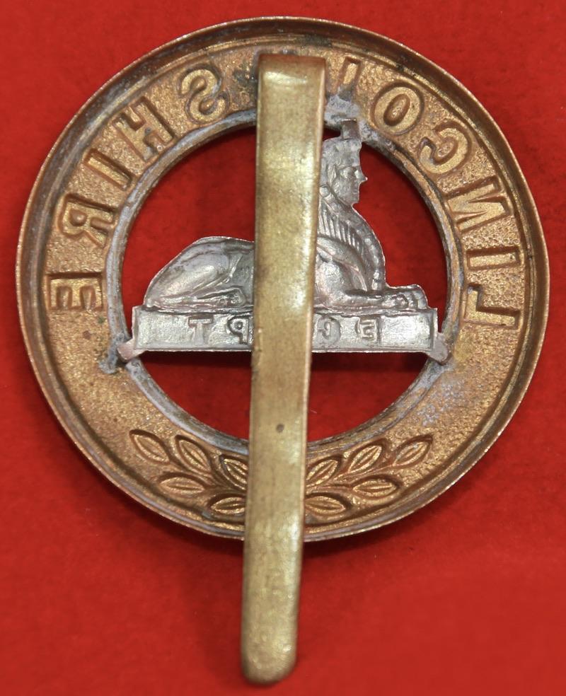 A bi-metal puggaree badge for The Lincolnshire Regiment with a long slider fastening. KK299.