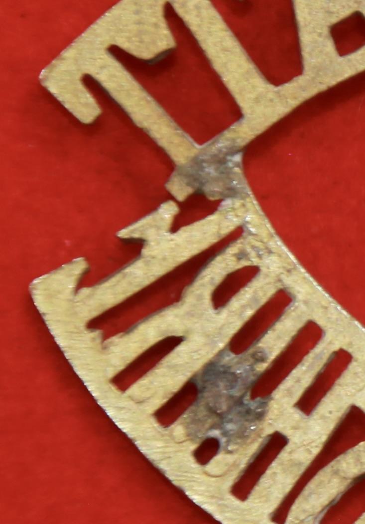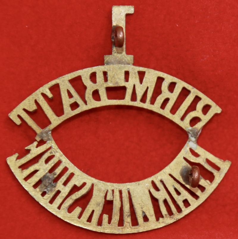 A rare, brass, shoulder title for the 14th (service) battalion of the Royal Warwickshire Regiment (1st Birmingham Battalion) with two of its three lug fastenings intact (north and east as viewed from the rear - the west lug is missing). Westlake 788.