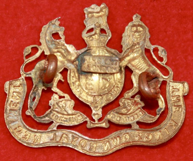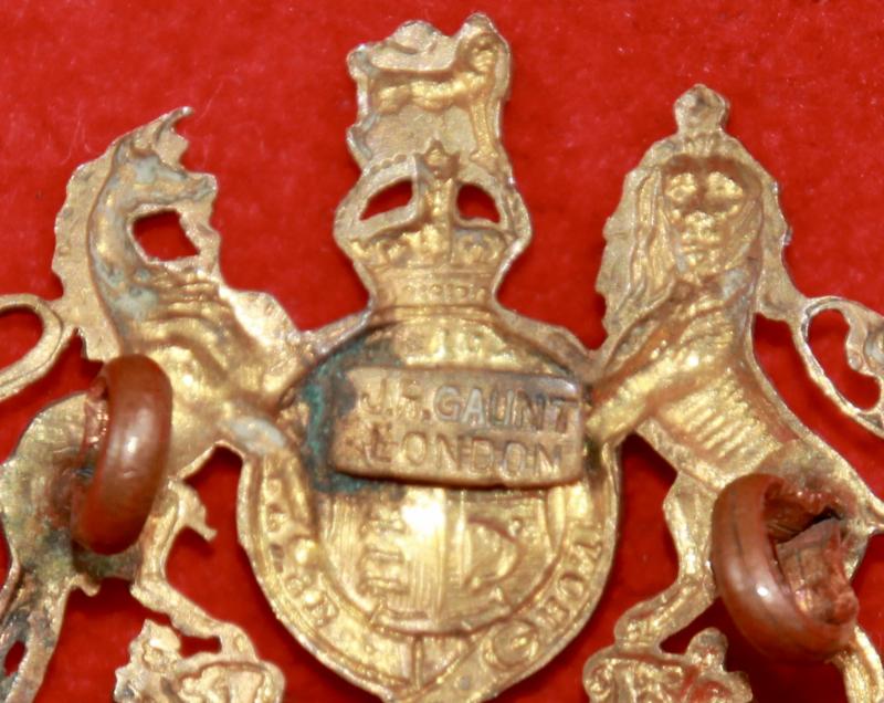 A brass collar badge for The Norfolk Yeomanry (King's Own Royal Regiment) with two lug fastenings (east and west). The reverse bears a plaque for manufacturer J.R. Gaunt London. Churchill & Westlake 98.