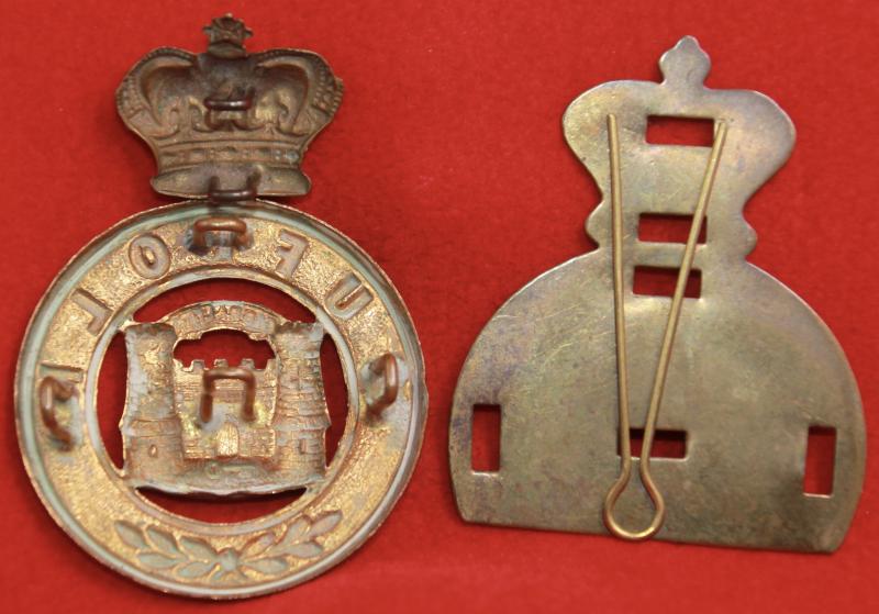 A two-piece, brass, glengarry badge for The Suffolk Regiment with its backing plate intact. There are two staple-style loop fastenings on the crown (north and south) and all four intact on the helmet plate centre. KK288/289/301.