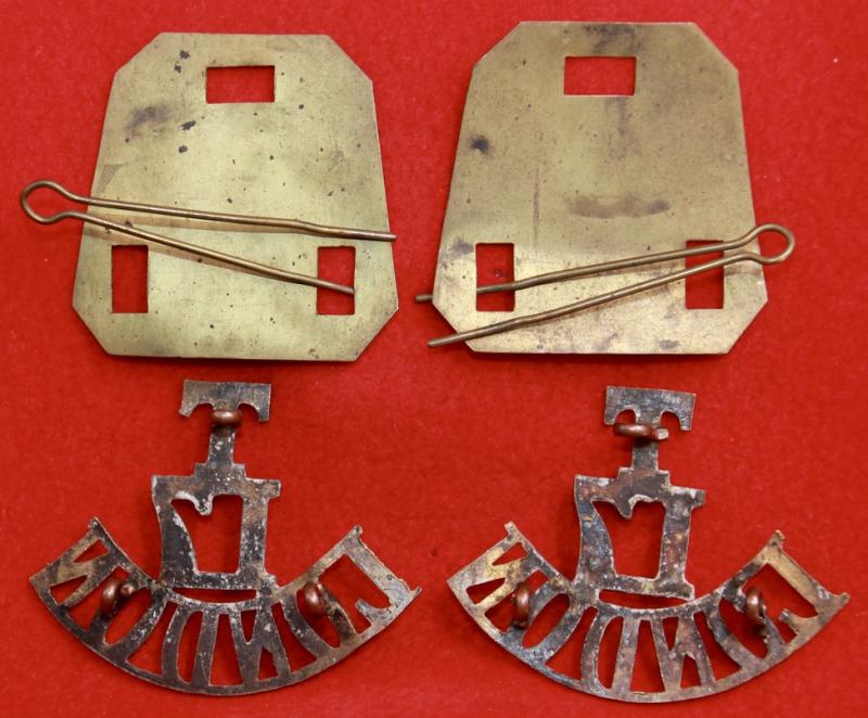 A pair of brass (previously blackened?) shoulder titles for the 17th (Poplar & Stepney) battalion of the London Regiment, each with three lug fastenings (east and west) and with their backplates intact. Westlake 1538.