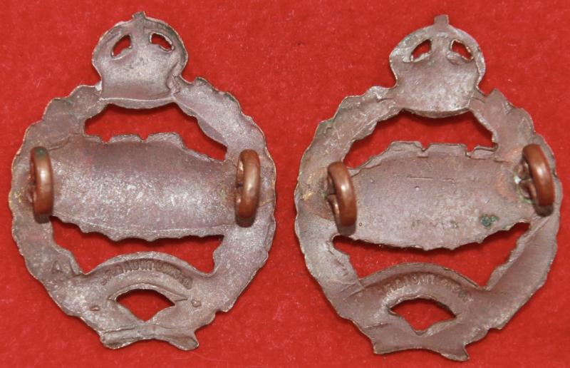 A pair of officer's service dress, bronzed, collar badges for The Royal Tank Regiment, each with two lug fastenings (east and west). The reverse of each is marked for manufacturer J.R. Gaunt London. As Churchill & Westlake 49.
