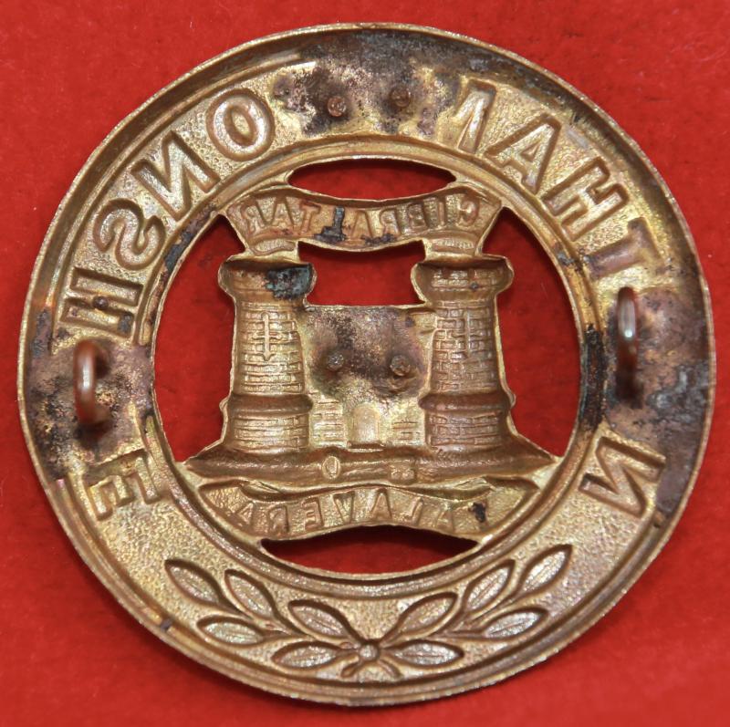 An early, two-towered, brass helmet plate centre for The Northamptonshire Regiment with two of its staple-style loop fastenings (east and west - as worn on the slouch hat). KK338.