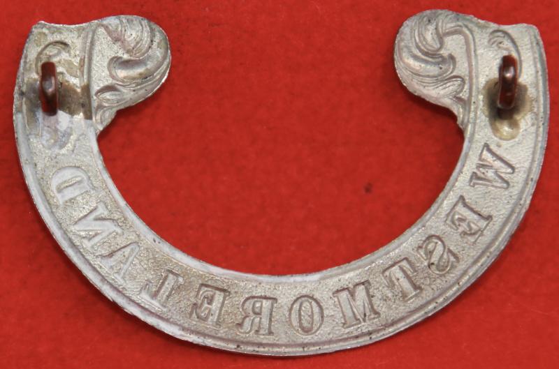 A rare, white metal, round forage cap badge for The Westmoreland Militia with two lug fastenings (east and west). Worn c1860.