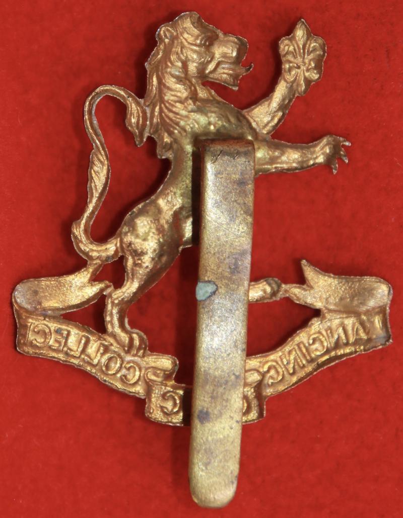 A brass cap badge for The Lancing College (West Sussex) Officer Trining Corps with a slider fastening. KK2605.