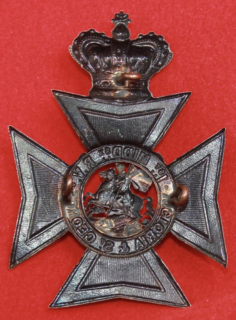 A scarce and attractive, blackened brass, helmet plate for The 1st Middlesex (Victoria & St George) Rifle Volunteer Corps with three lug fastenings (north, east and west).