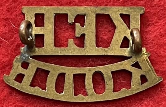 A brass shoulder title for the 1st King Edward's Horse (The King's Overseas Dominions Regiment) with two lug fastenings (east and west). Worn circa 1910 to 1924. Westlake 204.