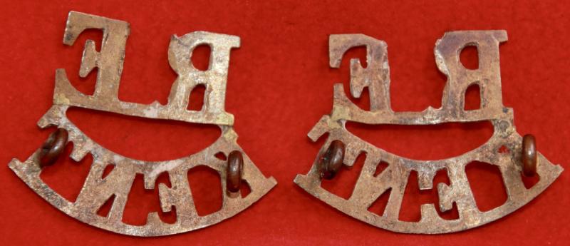 A pair of brass shoulder titles for the Kent (territorial) fortress engineers, each with two lug fastenings (east and west). Westlake 556. Note: I believe these titles had the T removed deliberately by the soldier.