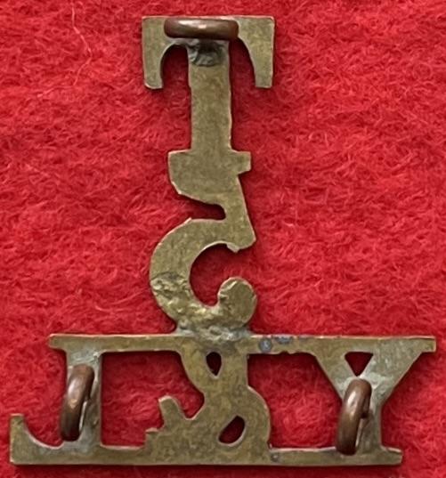 A brass shoulder title for the 5th (territorial) battalion of The York & Lancaster Regiment with three lug fastenings (north, east and west). Westlake 1341.