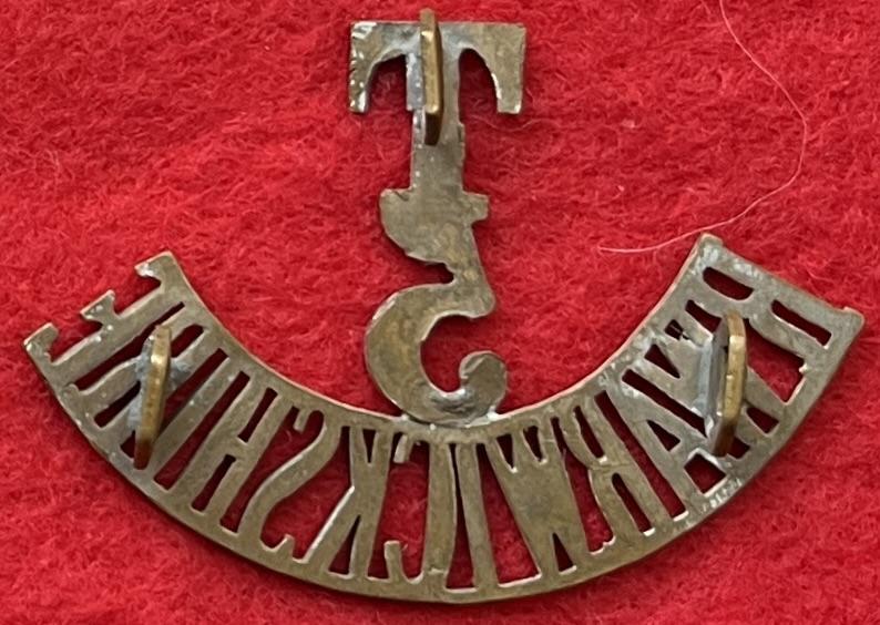 A brass shoulder title for the 5th (territorial) battalion of The Royal Warwickshire Regiment with three hexagonal lug fastenings (north, east and west). Westlake 784.