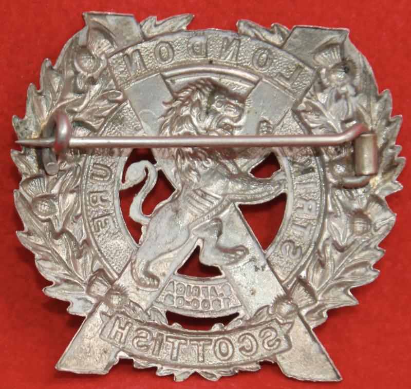 A white metal glengarry badge for the 14th battalion of The London Regiment (The London Scottish) with a pin fastening. KK1840.