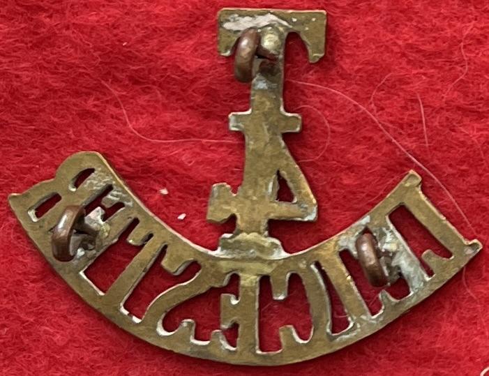 A brass shoulder title for the 4th (territorial) battalion of The Leicestershire Regiment with three lug fastenings (north, east and west). Westlake 914.