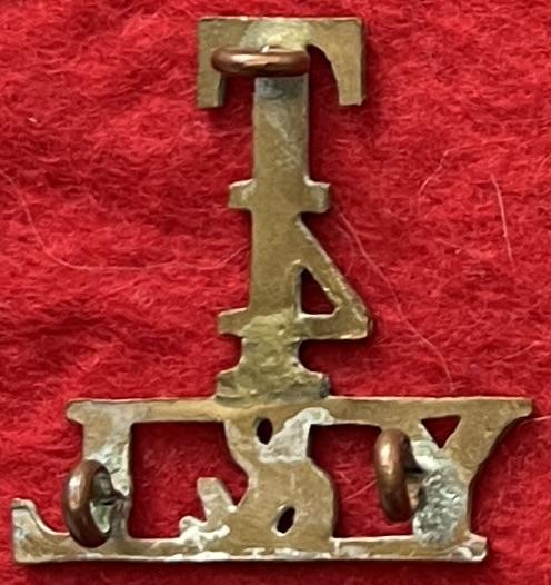 A brass shoulder title for the 4th (territorial) battalion of The York & Lancaster Regiment with three lug fastenings (north, east and west). Westlake 1340.