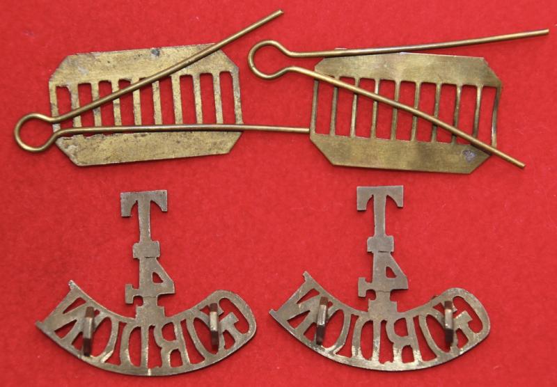 A pair of brass shoulder titles for the 4th (territorial) battalion of The Gordon Highlanders, each with two hexagonal lug fastenings (east and west). Westlake 1380.