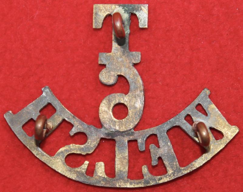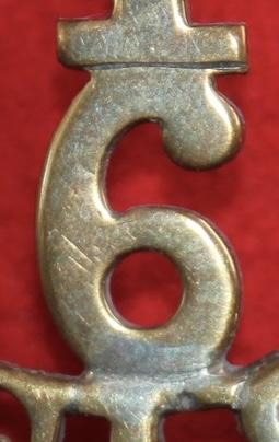 A brass shoulder title for the 6th (territorial) battalion of The Welsh Regiment with three lug fastenings (north, east and west). Westlake 1157.