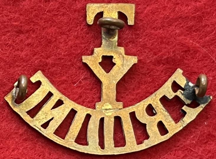 A brass shoulder title for The (territorial) East Riding of Yorkshire Yeomanry with three lug fastenings (north, east and west). Westlake 356.