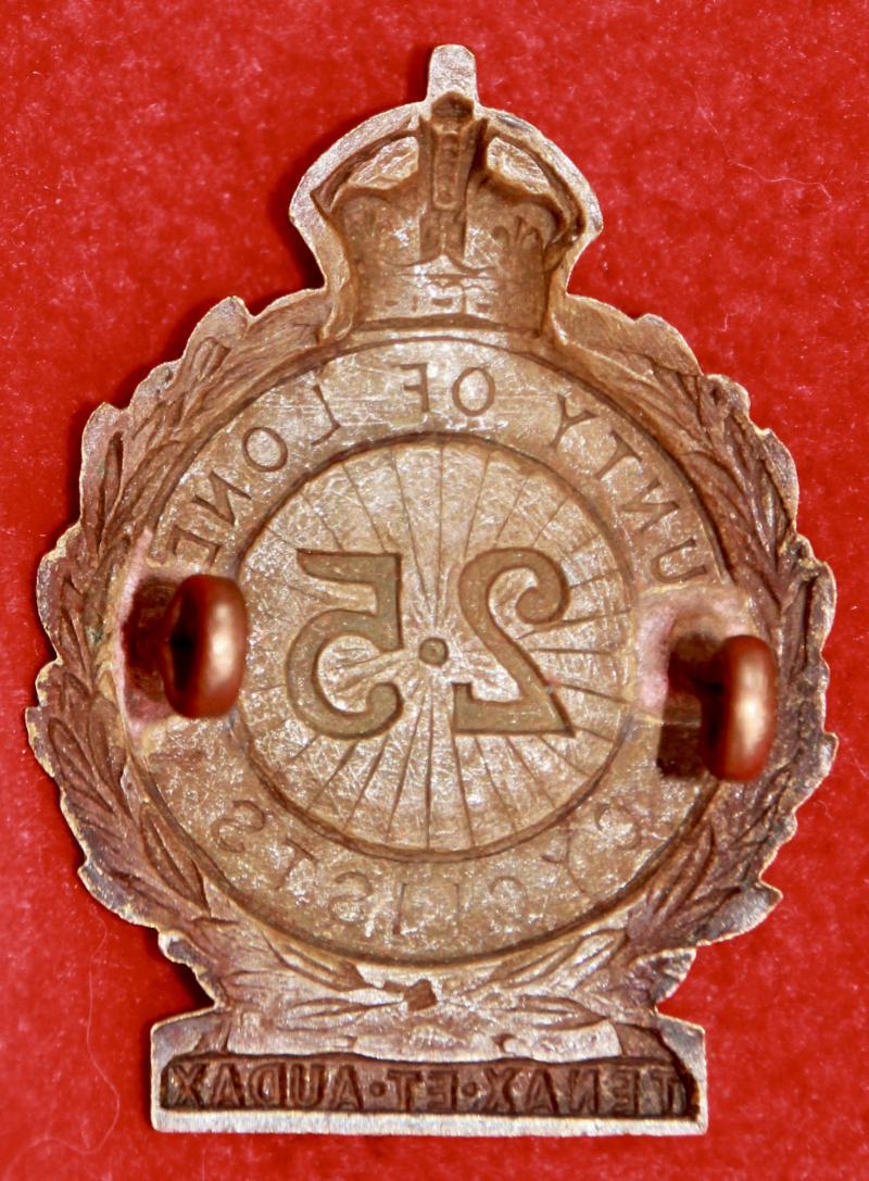 A nice, bronzed, cap badge for the 25th (Cyclist) battalion of The London Regiment with two lug fastenings (east and west). KK1857.