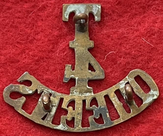 A brass shoulder title for the 4th (territorial) battalion of The Queen's (Royal West Surrey Regiment) with three lug fastenings (north, east and west). Westlake 737.